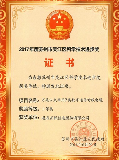 2017年度蘇州市吳江區(qū)科學(xué)技術(shù)進步獎(萬兆以太網(wǎng)用7類數(shù)字通信對絞電纜)
