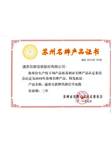 2018年蘇州市名牌產(chǎn)品(鐵路信號電纜)